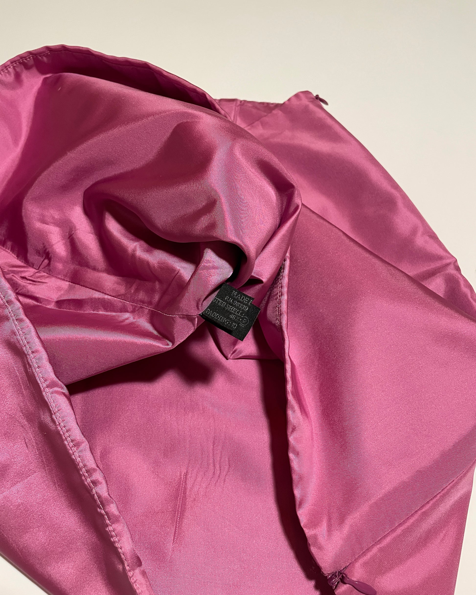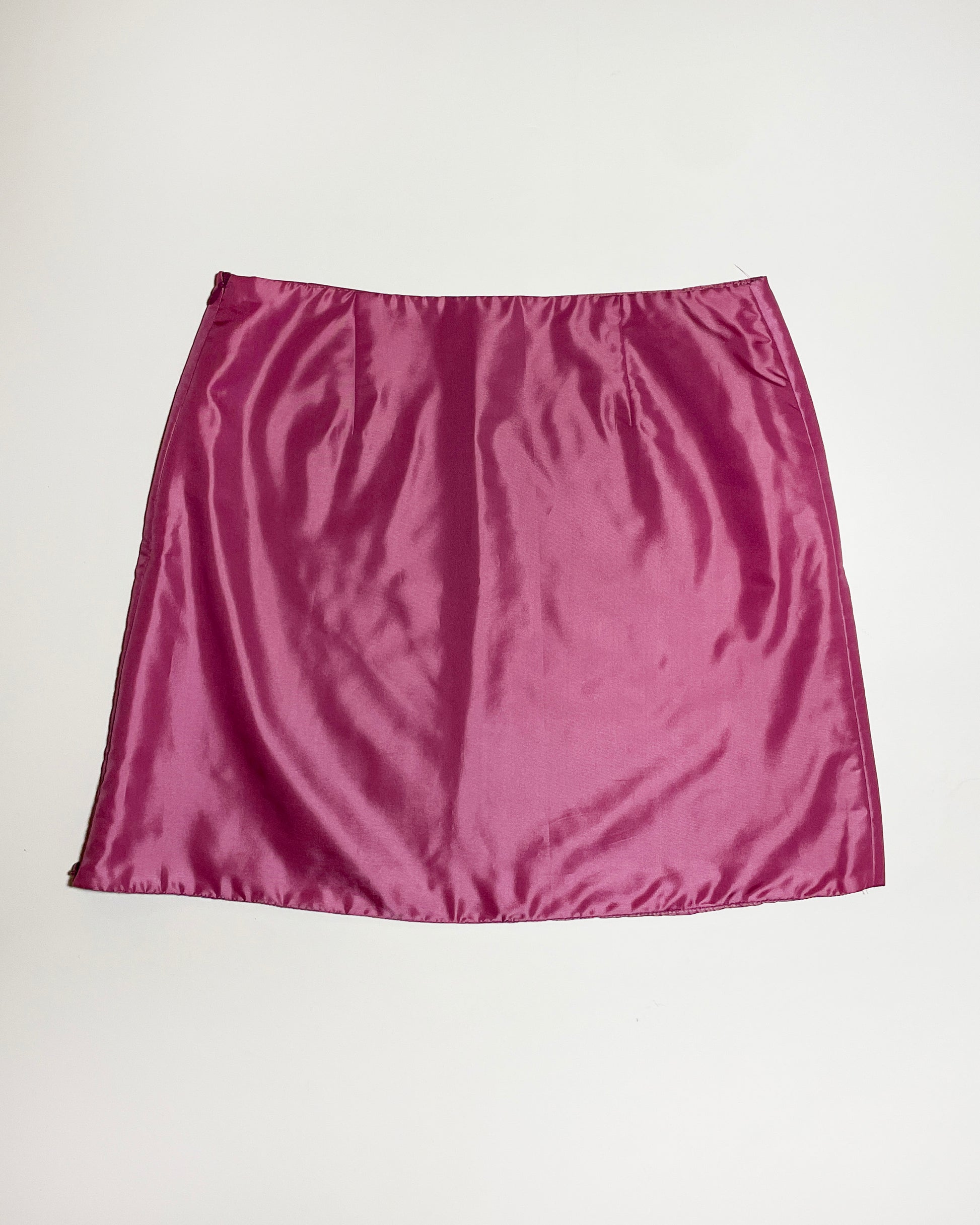 Mini pink nylon padded skirt with a side slip that can be open with zipper.